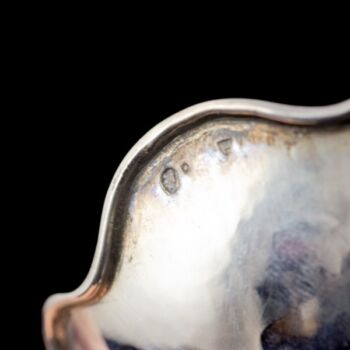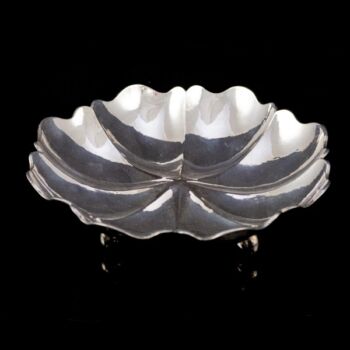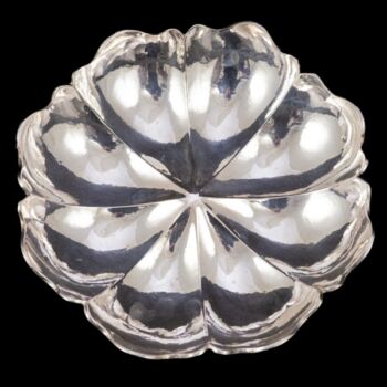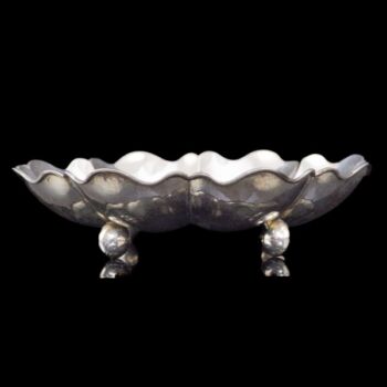 | 800-as finomságú ezüst, Nettó tömege: 292,4 gramm. Méretei: 5,5 x d:21,5 cm. Kerek formájú, nyolcosztatú, gerezdelt testű kínálótál négy mandula formájú lábbal. Kézzel kalapált kidolgozottságú. Jelzett: Pest, 1937-66 között használt fémjellel. | |