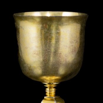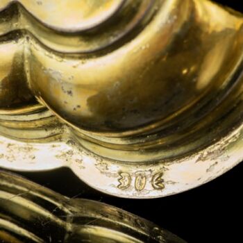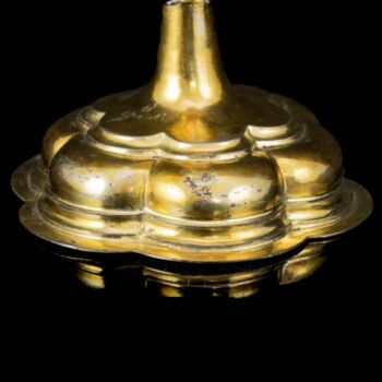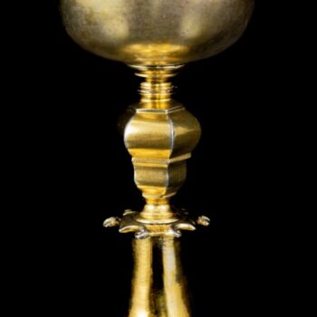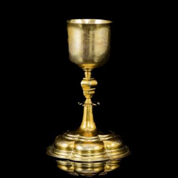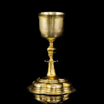 Tüziaranyozott, antik ezüst misekehely, Nettó tömege: 235 gramm, méretei: 18 x d: 12 cm. Feltehetően Németország, XVIII. század. Jelzett: talpában feloldatlan jelzésekkel.