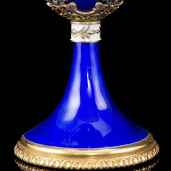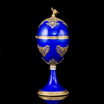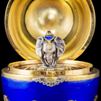 88 Zolotnyik fire-gilded silver ornamental egg on a pedestal with a blue luster enamel surface. With openwork, gilded silver appliqués, small, faceted diamond embellishments. Under the hinged opening lid of the egg, there is a silver elephant figure decorated with blue luster enamel and smaller, cabochon-cut rubies. Gross weight: 508 grams. Dimensions: 18 x d:6.7 cm. Marked: 88 Zolotnyik silver fineness Russian hallmark used between 1908-26 (St. Petersburg), with a Cyrillic Fabergé master's  mark.
