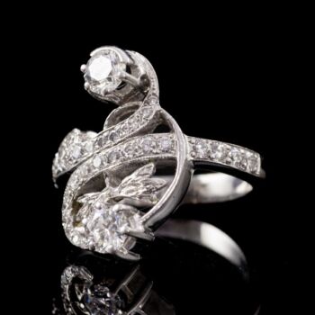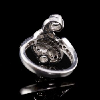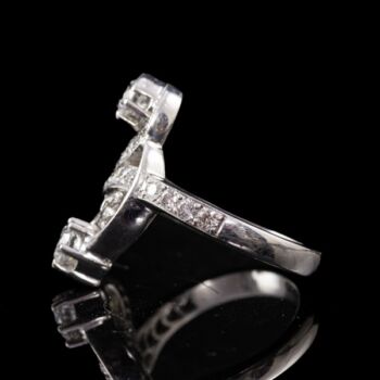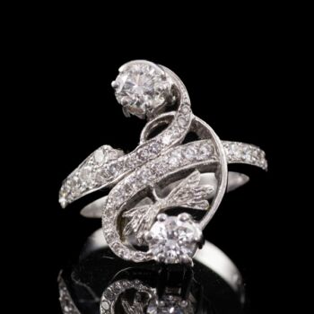 | 18 karátos fehérarany gyűrű, Bruttó tömege: 8,82 gramm. Szecessziós stílusú gyűrűfejben karmos foglalatban 2 nagyobb Cca. 075 ct. (M1; W-TCr; VVs) és 31 kisebb briliáns csiszolású gyémánt Cca. 0,60 ct. (M1; W; VVs-Vs) kővel. Jelzett: 18 K. Gyűrű mérete: 54. | |