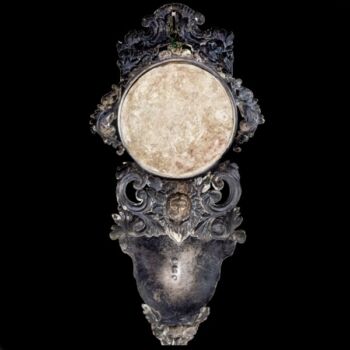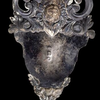 | Pressed, patinated silver wall-mounted holy water container with acanthus leaf and angel frame, with a medallion made of gilded copper under glass, decorated with pressed portraits of Christ and Mary. Gross weight: 98.8 grams. Dimensions: 21 x 11 x 3.5 cm. Marked: antique Italian hallmark between 1810-1872. | |