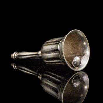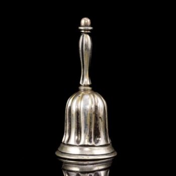 800-as finomságú, öntött ezüst kis csengő, Nettó tömege: 143,30 gramm; méretei: 10,5 x d:4,5 cm. Jelzett: 800-as finomságjelzéssel. Európa, XX. század első fele- közepe.