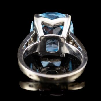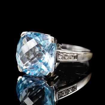 | Modern style, 18 K white gold ring, in a four-prong setting with a larger, fantasy-cut aquamarine. Approx. 10 ct. On the ring shoulders 3-3 brilliant-cut diamonds. Approx. 0.09 ct; (M1;TCa;Si). Marked: Mauboussin Paris; 750; Y8017. Ring size: 51.5. | |
