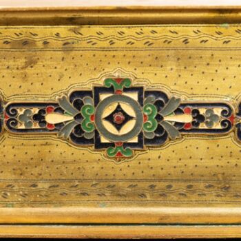 | Square-shaped, gilded copper box, raised on four legs, with a faceted glass top and hinged lid. The sides of the box are decorated with colorful compartment enamel decorations. Dimensions: 9.5 x 20 x 19.5 cm. Unmarked. Early 20th century. | |