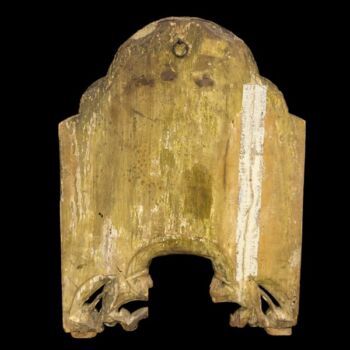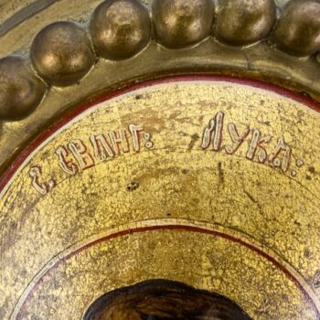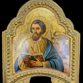 Hand-painted Orthodox icon on a wooden panel depicting the Evangelist Luke and his attributes. 18th-19th century, Russian. Tempera, wood. Size: 54.5 x 40 cm. On a footed, openwork, semicircular frame.