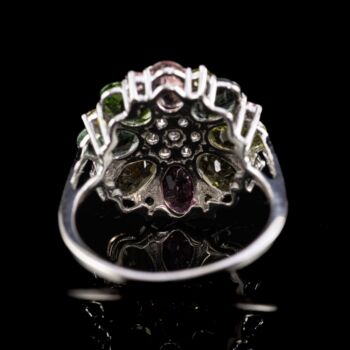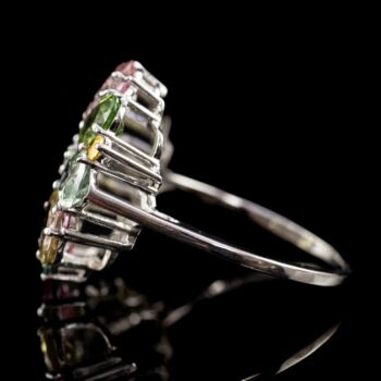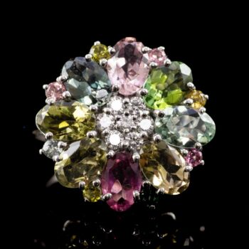 | Platinum ring with 16 colored tourmalines (total cca: 3.47 ct), with seven more brilliant-cut diamonds in the center (total cca: 0.0245 ct). Weight: 4.69 grams. Size: 55. Hallmarked: 950%. thousandths fineness platinum mark. | |