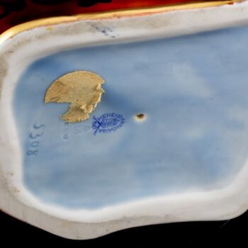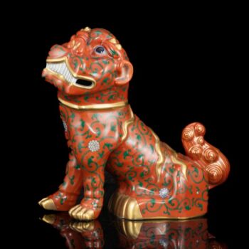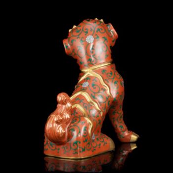 Festett, mázas Herendi porcelán Foo kutya figura gazdagon aranyozott részletekkel. Méretei: 25,5 x 26 x 12 cm. Jelzett: 1947-es Herendi márkajelzéssel és 5308 formaszámmal.