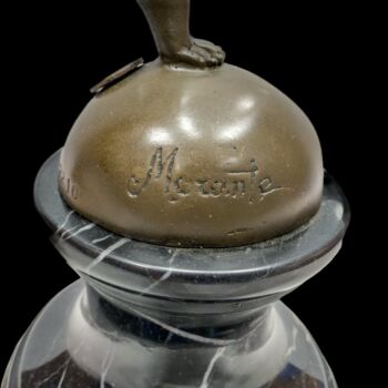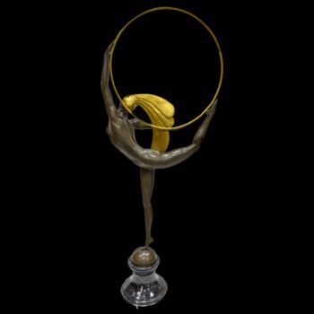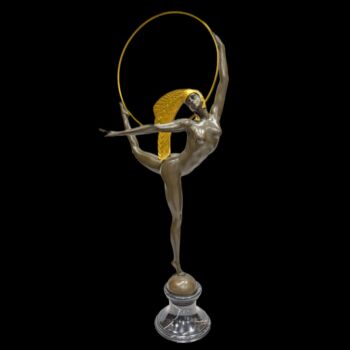 Arany festett, öntött bronz szobor, art deco táncosnő karikával, fején toll dísszel. Fekete márvány talapzaton. Méretei: 68,5 x d: 26,5 cm. Jelzett: Morante. XX. század vége.