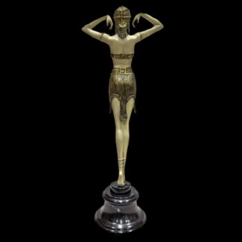 Gold-painted, cast bronze dancer statue on a black marble base, in the art deco style. Dimensions: 49 x d: 8 cm. Marked: D.H. Chiparus. Late 20th century, France.