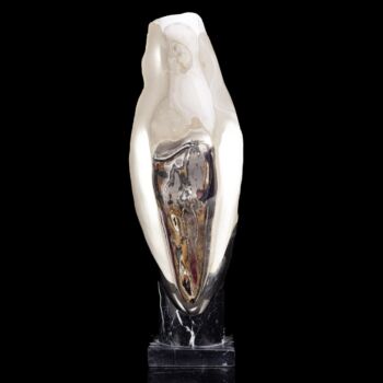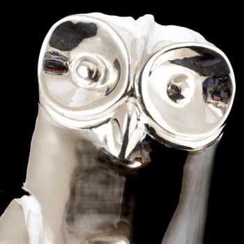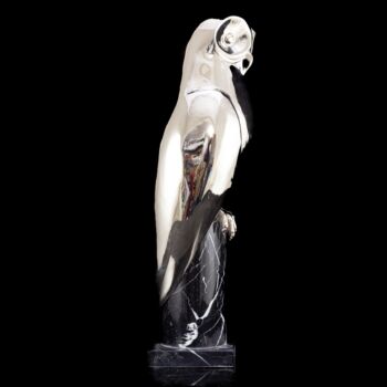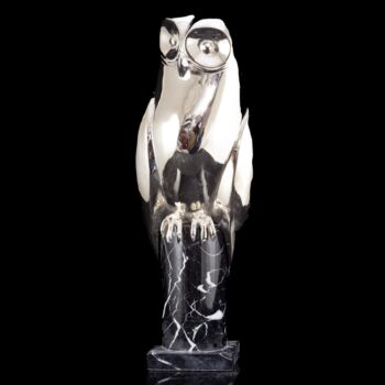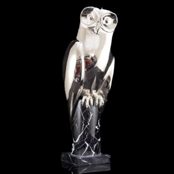 Króm-nikkelezett fém Bagoly figura fekete márvány talapzaton. Méretei: 42 x 17 x 12 cm. Jelzés nélkül. Modern.