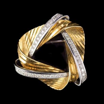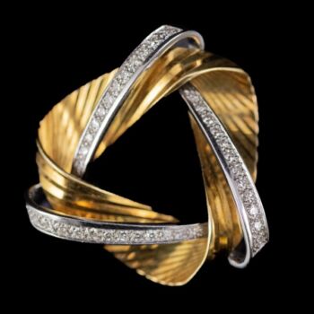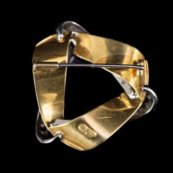 14 karátosra fémjelzett arany melltű/bross, 9,87 gramm. Önmagába visszatérő, háromszög formára alakított dupla arany szalag, melynek egyike brodázott sárgaarany, fölötte futó másik szalag fehéraranyból, melyet négykarmos foglalással 3 x 12 darab kisebb, Achtkant csiszolású gyémánt díszít, Cca. 0,70 ct. Méretei: 3 x 3 cm. Jelzett: 750-es finomságjelzéssel és egymásra írott AW készítőjelzéssel, valamint pótlólag beütött, 2016-tól érvényben lévő, 14 karátos arany-szerinti magyar fémjellel. |
