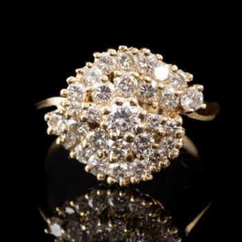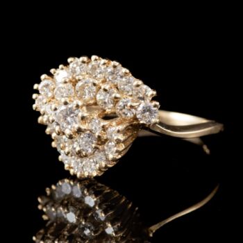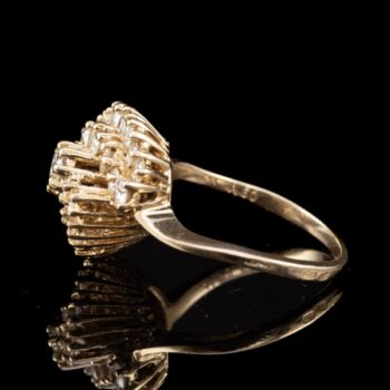| 14 karátos arany gyűrű, bruttó tömege:5,28 gramm. Kerek formájú gyűrűfejben 29 darab különböző méretű, lépcsőzetes elrendezésű, karmos foglalású, modern briliáns csiszolású gyémántokkal, mindösszesen Cca.:1,60 ct. (M1;TCr;Vs) Jelzett: 2016-tól használt magyar fémjellel, valamint gyűrűsín belső felületén "AA 1,60 " jelzéssel. Gyűrű mérete:56. | |
