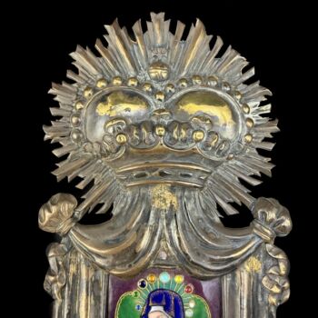 | Gilded, pressed silver holy water vessel, dimensions: 35 x 10 x 6 cm. Self-colored cobalt blue glass water vessel, framed with pressed acanthus leaves. Above the vessel there is a depiction of the Madonna on a copper plate, made using the Limoges enamel technique. Presumably Spanish or French, late 19th century-early 20th century. Unmarked. | |