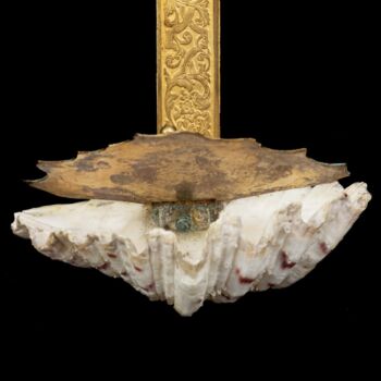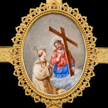 | Fire-gilded copper alloy with a hand-painted porcelain medallion on a cross and a water cup made of scallop shell, with lid. Overall size: 28.5 x 19.5 x 8 cm. With openwork decorations at the ends of the cross, with a detailed painted depiction of Christ and Saint Francis (of Assisi) in the medallion. 19th century, presumably Italy. | |