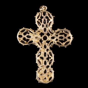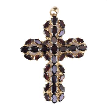 | 14 karátos arany kereszt függő fazettált cseh gránátkövekkel ékítve, Bruttó tömege:14,88 gramm. Méretei:55 x 40 mm. Karmos foglalással 39 darab, vegyesen ovál,- navette és kerek csiszolású gránáttal Cca. 8 ct. Jelzett: 1968-tól használt olasz fémjellel. | |