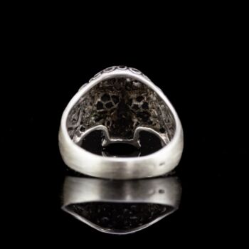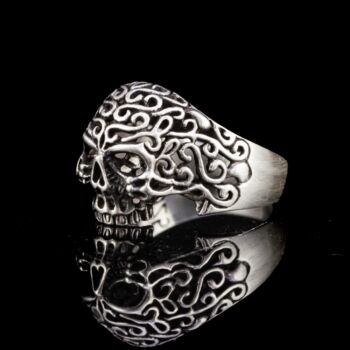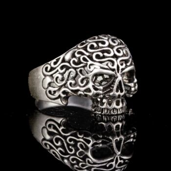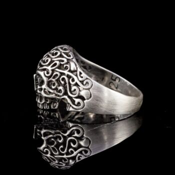 | Selyemfényű, mattított 925-ös finomságú ezüst gyűrű, Nettó tömege:5,29 gramm. Kézzel fűrészelt áttört koponya gyűrűfejjel. Modern. Jelzett: elmosódott fémjellel, valamint 925-ös finomságjelzéssel, "SIL" készítőjellel. Gyűrű mérete: 59. | |