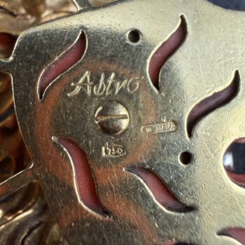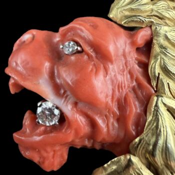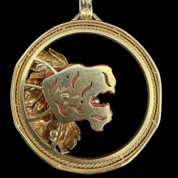 | Kerek formájú, 18 karátos arany keretben korallköves oroszlán medál, Bruttó tömege: 43 gramm. Méretei: 6,5 x d: 5,5 cm. Kézzel faragott, természetes színű korall oroszlán fej, 1 nagyobb és 1 kisebb briliáns csiszolású gyémántkővel Cca.0,25 ct; (M1/F1; TCr; Vs) Jelzett: 18 karátos, 1968-tól használt olasz (Milánó) fémjellel. | |