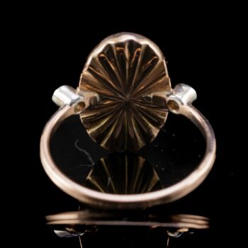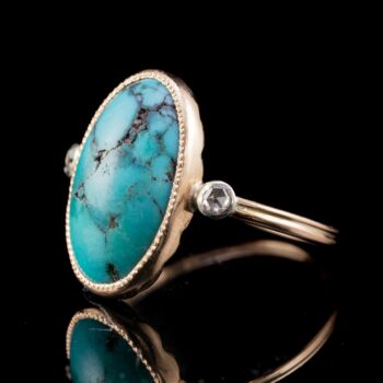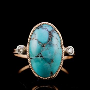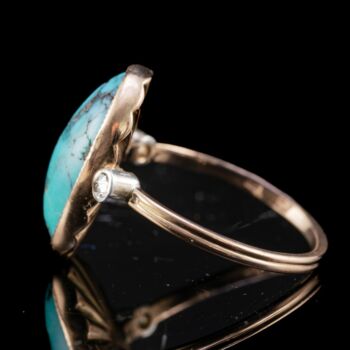 | 14 karátos női arany gyűrű középen egy ovális türkiz kővel (15 x 9 mm), mellette ezüst foglalatban 1-1 rózsacsiszolt gyémánttal (összesen cca: 0.094 ct). Tömege: 3.6 gramm. Gyűrű mérete: 56. Jelzett: 2016-tól használt belföldi, 585%. ezrelékes arany fémjellel. | |