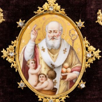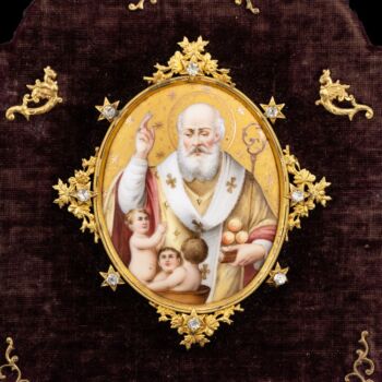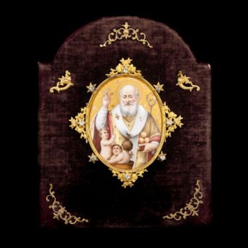 | Bari Szent Miklós festett zománckép üveg kövekkel díszített aranyozott réz keretben, réz rátétekkel díszített bársoy borítású karton lapra rögzítve. XIX. század vége, Olaszozrszág. Jelzés nélkül. Zománckép mérete: 85 x 66 mm. | |