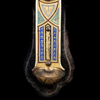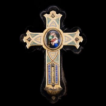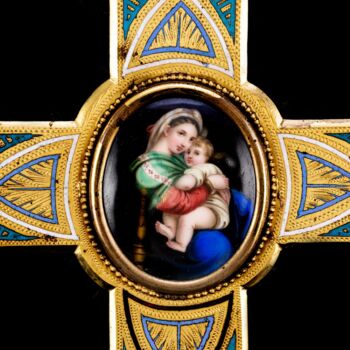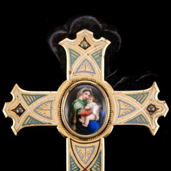 | Aranyozott bronz szenteltvíztartó kereszt színes hidegzománc díszítéssel, közepén Raffaello Széken ülő Madonna festményének ovális, porcelánra festett másával. Feltehetően XIX. század vége, olasz vagy francia műhely. Fekete bársony borítású fa lapra rögzítve. Teljes méret: 31 x 22 cm. Jelzés nélkül. | |