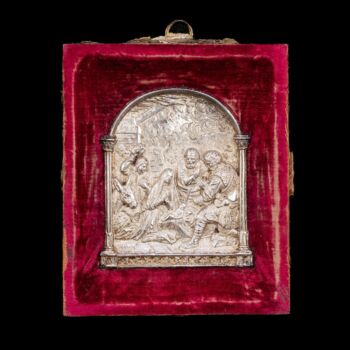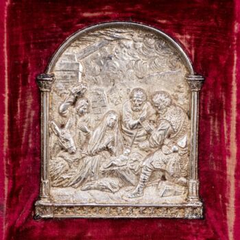 Krisztus születése ezüstözött vörösréz dombormű vörös bársony borítású fa keretben. Teljes méret: 15 x 12.5 cm. Dombormű mérete: 10 x 8.5 cm. XX. század eleje, olasz. Jelzés nélkül.