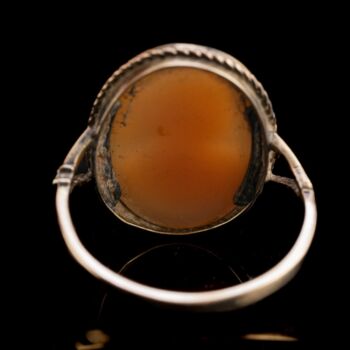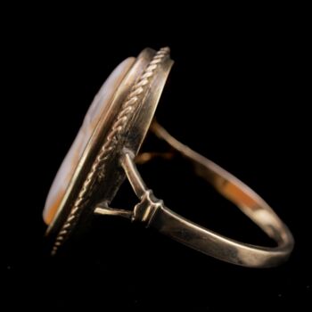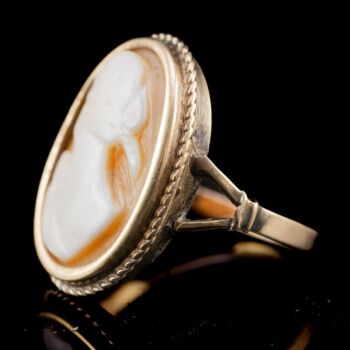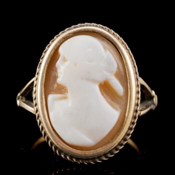 14 karátos arany gyűrű, Bruttó tömege: 3,4 gramm. Gyűrűfejben arannyal lemezelt foglalással kézzel faragott kagylókámea. Jelzett: 1925-től használt osztrák fémjellel. Gyűrű mérete:53,5.