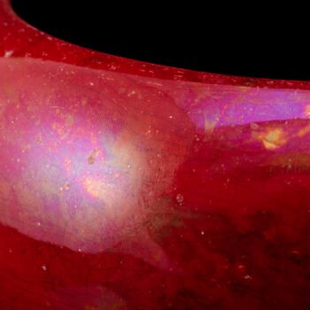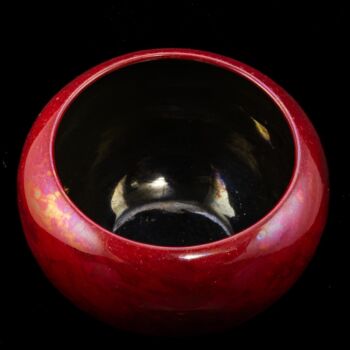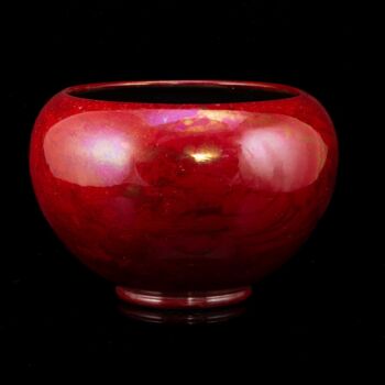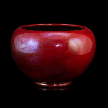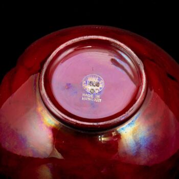 Gömbölyű formájú, Zsolnay ökörvérmázas fajansz kaspó, méretei: 12,5 x d:17,5 cm. Jelzett: Zsolnay Pécs írott körpecsétes, Made in Hungary márkajelzéssel, 1913-1918 között.