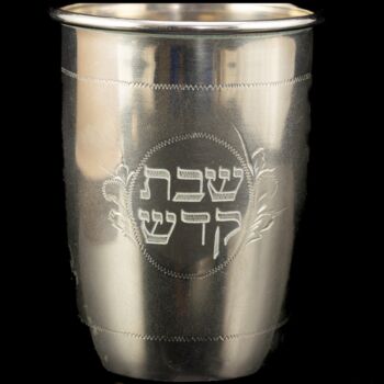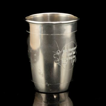 Ezüstözött alpakka Kiddush pohár, palástján poncolt héber felirattal. Méretei: 7,4  x d:5,5 cm. Jelzett: talpán PV alpakka benyomott felirattal. XX. század közepe.