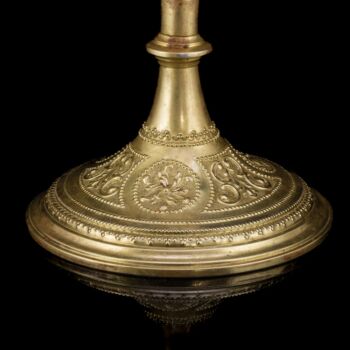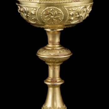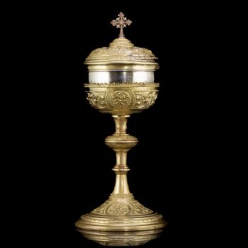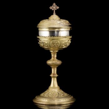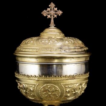 | Sárgaréz(ötvözet) cibórium, 800-as finomságú ezüst ostyatartó kehellyel. Kerek talpról felhúzott, nódusszal tagolt szár, és kehely fedéllel. Fedélének tetején vörösréz kereszttel. Méretei: 32 x d: 14 cm. Ezüst kehelyben jelzett: 1867-1936 között használt pesti fémjellel. | |