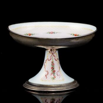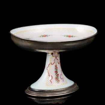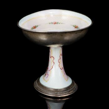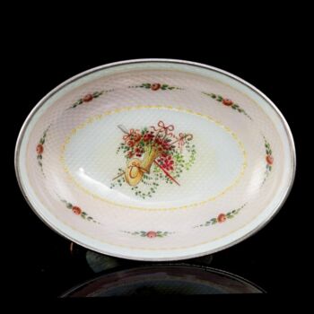 | 14 karátos rozé aranylemezzel és 925-ös finomságú ezüstből készült kis ékszertartó tálka. Ovális formájú talpról felhúzott, ovál forma kistálka, tükrében transzparens fehér és rózsaszín lüszterzománcozás, tükrében festett virágkosár díszítéssel. Bruttó tömege: 133,2 gramm. Méretei: 6,5 x 9,5 x 7 cm. Jelzett: 1867-1872 között használt bécsi fémjellel. Restaurálás nyomaival. | |