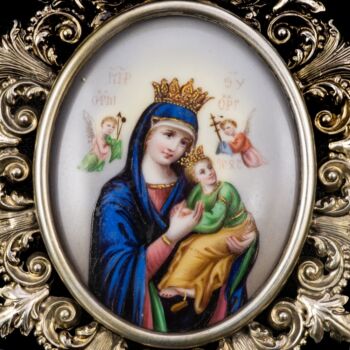 | 800-as finomságú préselt ezüst keretben ovális formájú, porcelánra festett Szűzanya karján a kis Jézussal, anygyalokkal. Hátoldalán kék bársony takarással. Méretei:8 x 6,5 cm. Jelzett: Bécs, 1872-1922 között használt fémjellel. | |