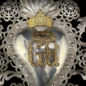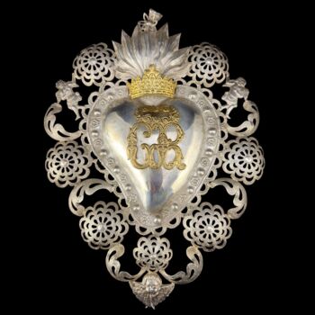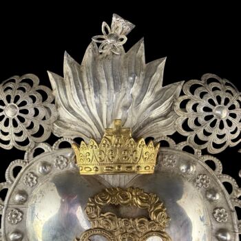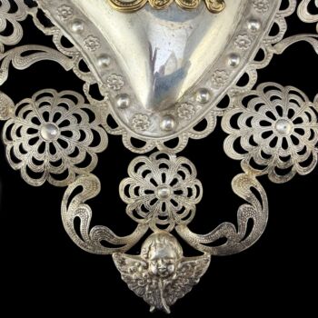 | Préselt, antikolt ezüst szív, tetején lángnyelvvel, aranyozott koronával. Oldalélein levél szerű díszitményekkel és áttört rozettákkal, 1-1 egészalakos angyal figurával. Szív közepére aplikált aranyozott GR betűk (Grazia Ricevuta- Kegyelemben részesült). Nettó tömege: 49,05 gramm. Méretei: 26 x 20 cm. XIX. század közepe. | |