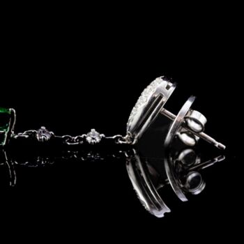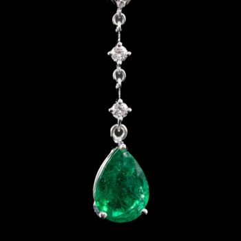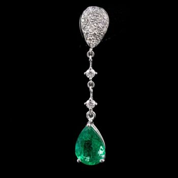 | 18 karátos fehérarany fülbevaló pár egy-egy csepp alakú brazil smaragd kővel (1.83ct + 1.85 ct, összesen: 3.68 ct), 24-24 darab kerek, briliáns csiszolású gyémánttal (összesen: 0.60 ct, M1,W,VVs). Bruttó: 6.07 gramm. Jelzett: 1968-tól használt olasz, 750%.ezrelékes arany fémjellel, Massimo Raiteri olasz készítői jelzéssel. Stiftes fazonú. Egyik smaragd kövön apró csorbulás! | |