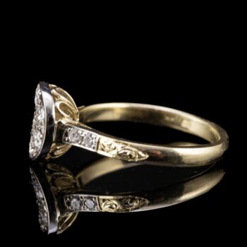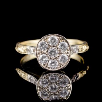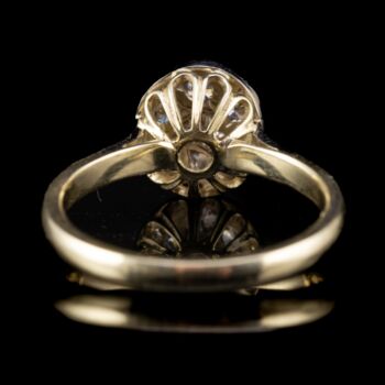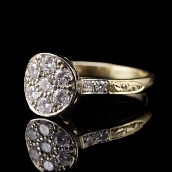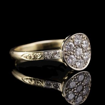 | 14 karátos női arany gyűrű, kerek, ezüst gyűrűfejben 7 darab briliáns csiszolású gyémánt kővel (összesen cca: 0.70 ct, M1, TCr (I-J), Vs), a gyűrűvállakon további 2-2 achtkant-csiszolású gyémánttal (összesen cca: 0.12 ct). Jelzett: 2016-tól használt belföldi, 585%.ezrelékes arany fémjellel. Bruttó: 3.34 gramm. Gyűrű mérete: 54. | |