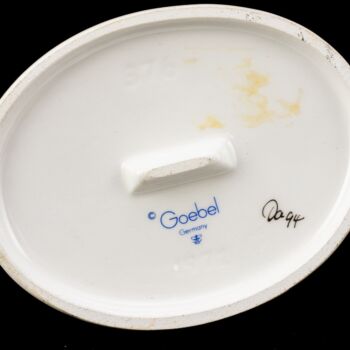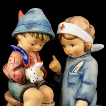 | Goebel "Little Nurse" kerámia figura. Kétalakos, festett kerámia figura széken ülő, vérző ujjú kisfiúval, mellette a sebet ellátó kis nővérrel. Jelzett: 1990-1999 között használt, kékkel bélyegzett Goebel márkajelzéssel, masszába nyomott 376-os formaszámmal. 11 x 9 x 6.5 cm. | |