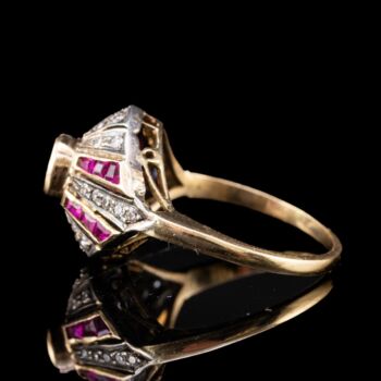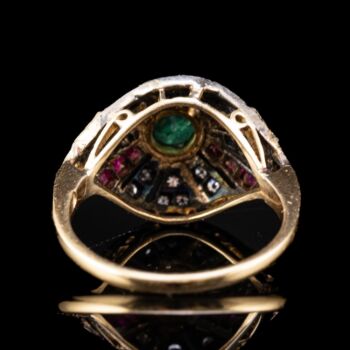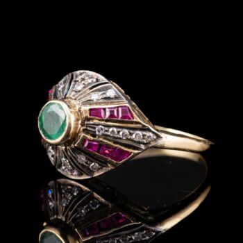 | 14 karátos arany, Bruttó tömege:5,1 gramm. Kúp alakú, áttört gyűrűfej közepében arannyal lemezelt, zárt foglalatban 1 nagyobb, briliáns csiszolású smaragd Cca.0,50 ct.; 12 táblás csiszolású rubin Cca. 0,80 ct; 24 Achtkant csiszolású gyémánt Cca.0,12ct. Jelzett: elmosódott orosz, 56 Zolotnyikos fémjellel. | |