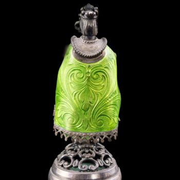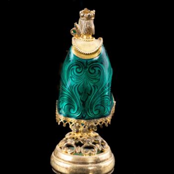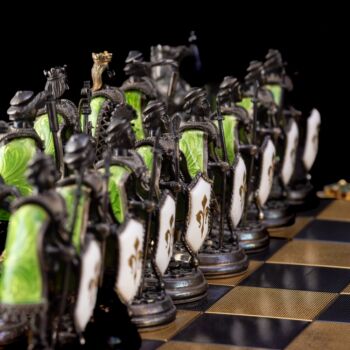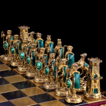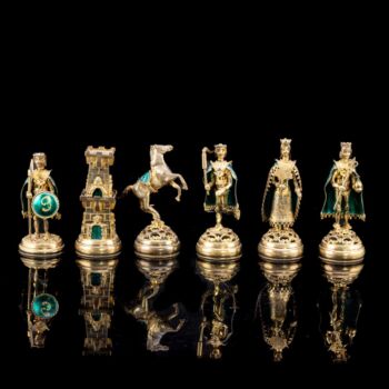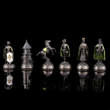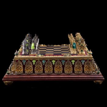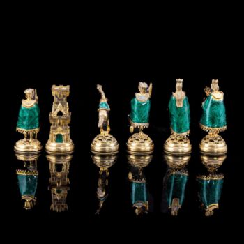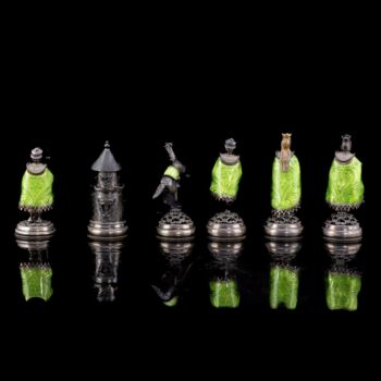 | 925-ös finomságú, aranyozott ezüst sakk készlet vöröses barnára pácolt, lakkozott fa dobozon, aranyozott ezüst sakkbábúkkal, melyek fehér opak,- illetve zöld lüszterzománccal díszítettek. Sakktábla kabochon csiszolású jade-nefrit valamint fehér tenyésztett gyöngyökkel ékítve. Tábla méretei: 12 x 36 x 36 cm. Bruttó tömege figurákkal együtt: 4600 gramm. Készült: Budapest, XX: század közepe-második fele, Pénzverde műhelyében. | |