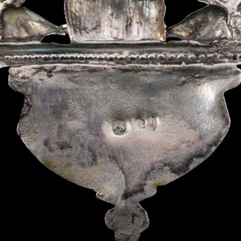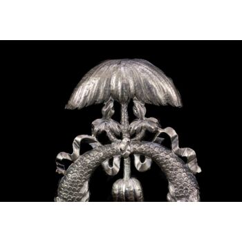 Préselt, olasz antik ezüst szenteltvíztartó delfines szökőkút díszítéssel. Nettó tömege: 63,8gramm; Méretei: 16,5 x 10 x 3,5 cm. Jelzett: 1810-72 között használt antik olasz fémjellel.