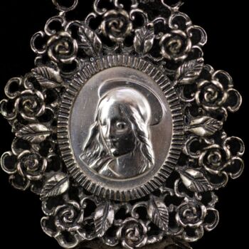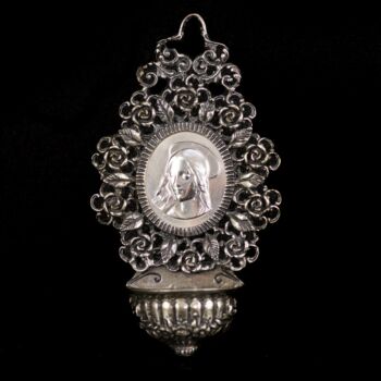 | Öntött, 800-as finomságú ezüst szenteltvíztartó, áttört, rózsakoszorúval ölelt Szűzanya képmásával. Nettó tömege: 66,10 gramm, méretei: 11,5 x 6,5 x 2 cm. Jelzett: 1968-tól napjainkig használt modern olasz fémjellel. | |