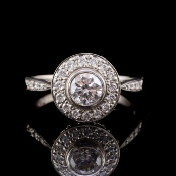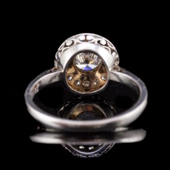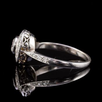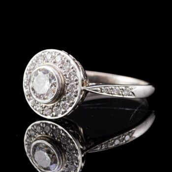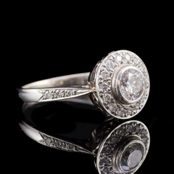 | Modern rozetta fazonú, 18 karátos fehérarany gyűrű, Bruttó tömege:3,5 gramm. Kerek formájú gyűrűfej közepében arannyal lemezelt, zárt foglalatban 1 modern briliáns csiszolású gyémánt Cca. 0,685 ct; (M1; W; VVs) körben és gyűrűvállakon további 22 kisebb briliáns csiszolású gyémánt Cca. 0,2 ct. Jelzett: 2006-16 között használt magyar fémjellel, valamint gyűrűsín belsejében "0,885 ct". Gy.M: 55. | |