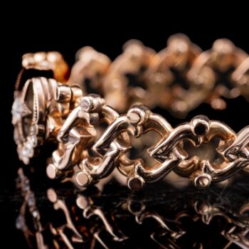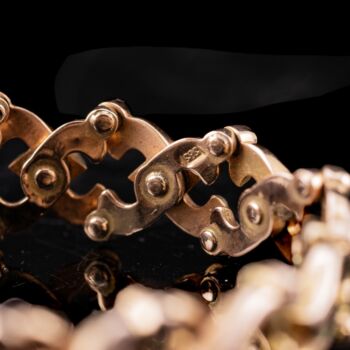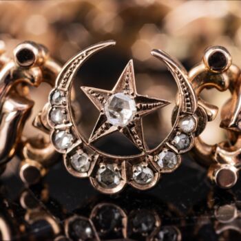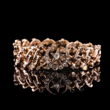 | 14 karátos rozé arany rugós elemekből álló, áttört karkötő, amelynek díszében egy hold és közepében egy ötágú csillag fazettált gyémántokkal ékítve.Bruttó tömege: 17,7 gramm. 10 darab, különböző nagyságú, rózsacsiszolású gyémánt mindösszesen Cca.0,49 ct. Jelzett: több helyen is "H.Oreves" jelzéssel. | |