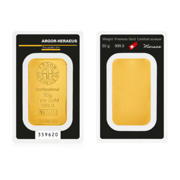 Refiner: Argor-Heraeus (Switzerland) Weight: 50 grams Fineness: 999,9 / 1000 Dimensions: 49.7 x 28.5 x 2.0 mm Sealing: Original plastic case with serialized manufacturer's certificate |