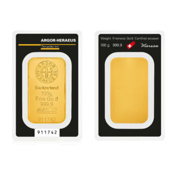 Refiner: Argor-Heraeus (Switzerland) Weight: 100 grams Fineness: 999,9 / 1000 Dimensions: 49.7 x 28.5 x 3.9 mm Sealing: Original plastic case with serialized manufacturer's certificate |