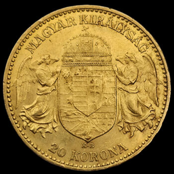 20 Korona 1902 KB Ferenc József. 900%. ezrelék (21.6KT-os) finomságú arany érme. Tömege: 6.76 gramm. Átmérője: 21 mm. Körmöcbánya. Készült összesen: 522 598 darab. Fine. Előlap: FERENCZ JÓZSEF I · K · A · CS · ÉS M · H · S · D · O · AP · KIR · 1902 Hátlap: MAGYAR KIRÁLYSÁG KB 20 KORONA Peremén: Bizalmam az ősi erényben |
