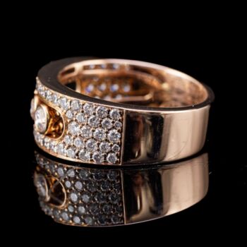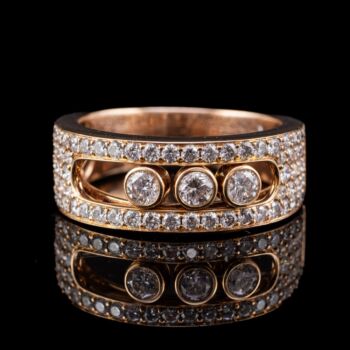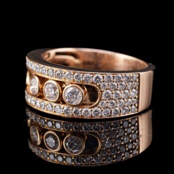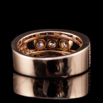 | 18 karátos rozéarany gyűrű briliánsokkal, Bruttó tömege: 6,2 gramm. Karikagyűrű fazonú gyűrűsín, áttört gyűrűfej, benne 3 nagyobb, arannyal lemezelt, zárt foglalatban modern briliáns csiszolású gyémánt Cca.0,30 ct (M1;W;VVs2) további 70 apró, modern briliáns csiszolású gyémán ékítés Cca.0,70 ct. Mindösszesen Cca.1,04 ct. | |