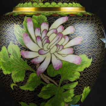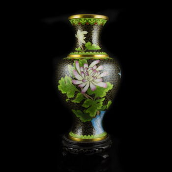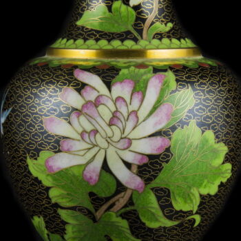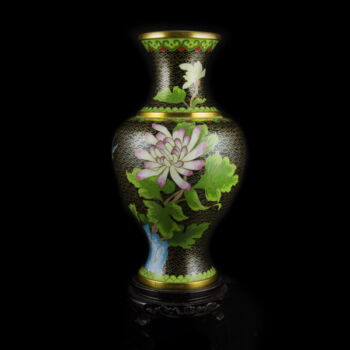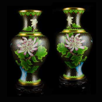 Chinese brass pair of vases with cloisonné decoration. Black enamel background with a flowery branch of tree and bird. Second half of XXth century. China. Height: 23.5 cm.