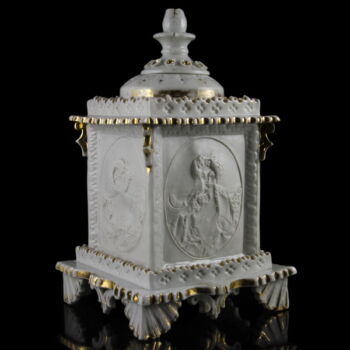 | Porcelain lithophane, lantern, candle holder: candle holder consisting of 3 pieces, which is only partly white glazed porcelain, with the traces of gold painting, resembling the shape of a small house, standing on a rectangular base. The side slabs are made of thinner bisquit porcelain, which portray different ladies. Dimensions: 22 x 13 x 13 cm. Without sign. Second half - end of XIXth century. | |