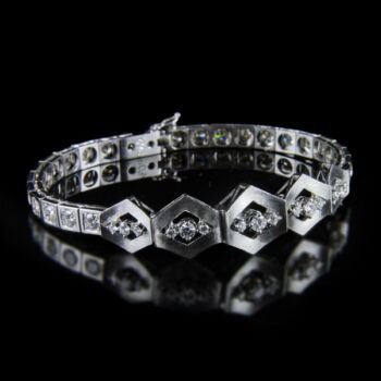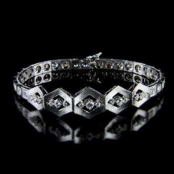 Art deco style white gold and diamond bracelet: 18 K white gold, 21.39 grams, 18.5 x 1.5 cm. 23-part armband, with 1-1 brilliant-cut diamonds in each piece, 5 matte-surfaced hexagonal fields in the middle, in an alliance arrangement, 3-3 brilliant-cut diamonds in pronged settings, altogether approx. 4 ct. (M1; W; VVs2). Signed: with domestic hallmark used since 2016. |
