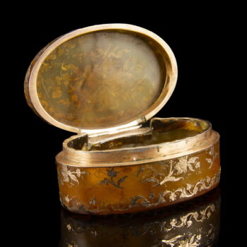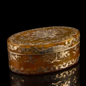 | Oval-shaped horn box with an inlaid / hammered gold decoration, with a hinged cover and a surrounding golden leaves decoration on its mantle and base, and with a gold bunch of flowers. (The inlaid and hammered gold inlay is missing in certain places!) Gross weight: 88 gr. 83 x 53 x 33 mm. | |