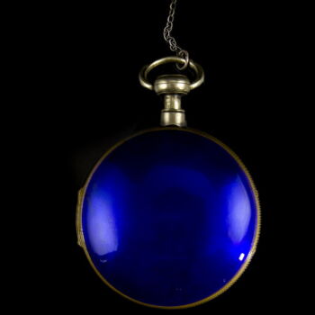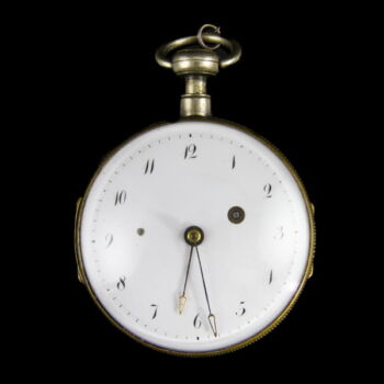 | In a copper alloy case there is the keyed mechanism from the side facing the dial that can be tightened with a key. Its silver plating is heavily worn. Arabic numerals, indexed, white enamel dial with bluish steel hands. Diameter of watches: 5.2 cm. From Switzerland from around 1820-30. In working condition. | |